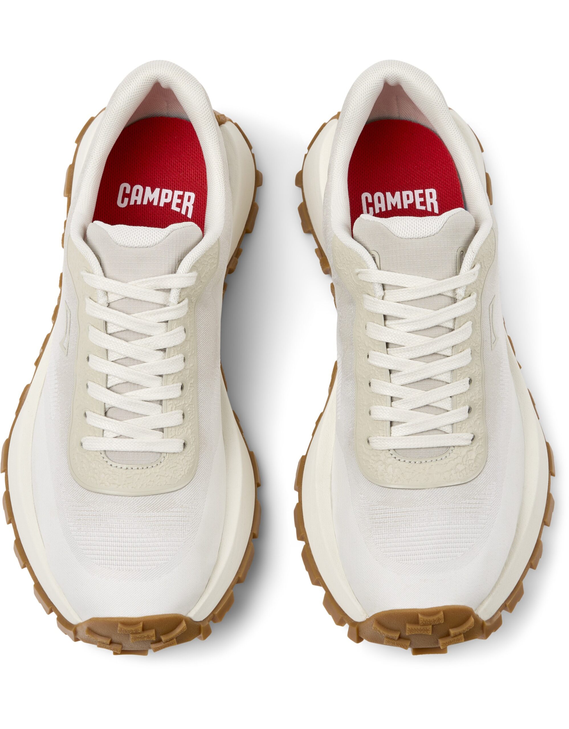Kadınlar için bej ve beyaz, geri dönüştürülmüş teknik malzemelerden üretilmiş spor ayakkabılar;