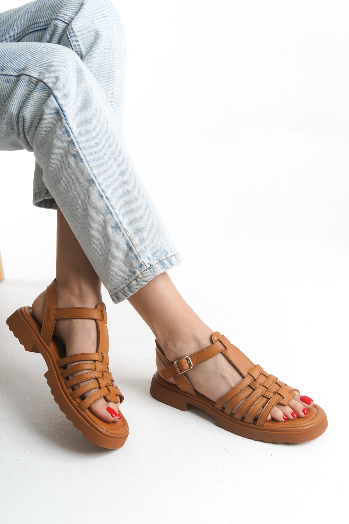 Sur Sandalet Kadın Taba Deri Günlük Klasik Sandalet M-649-T